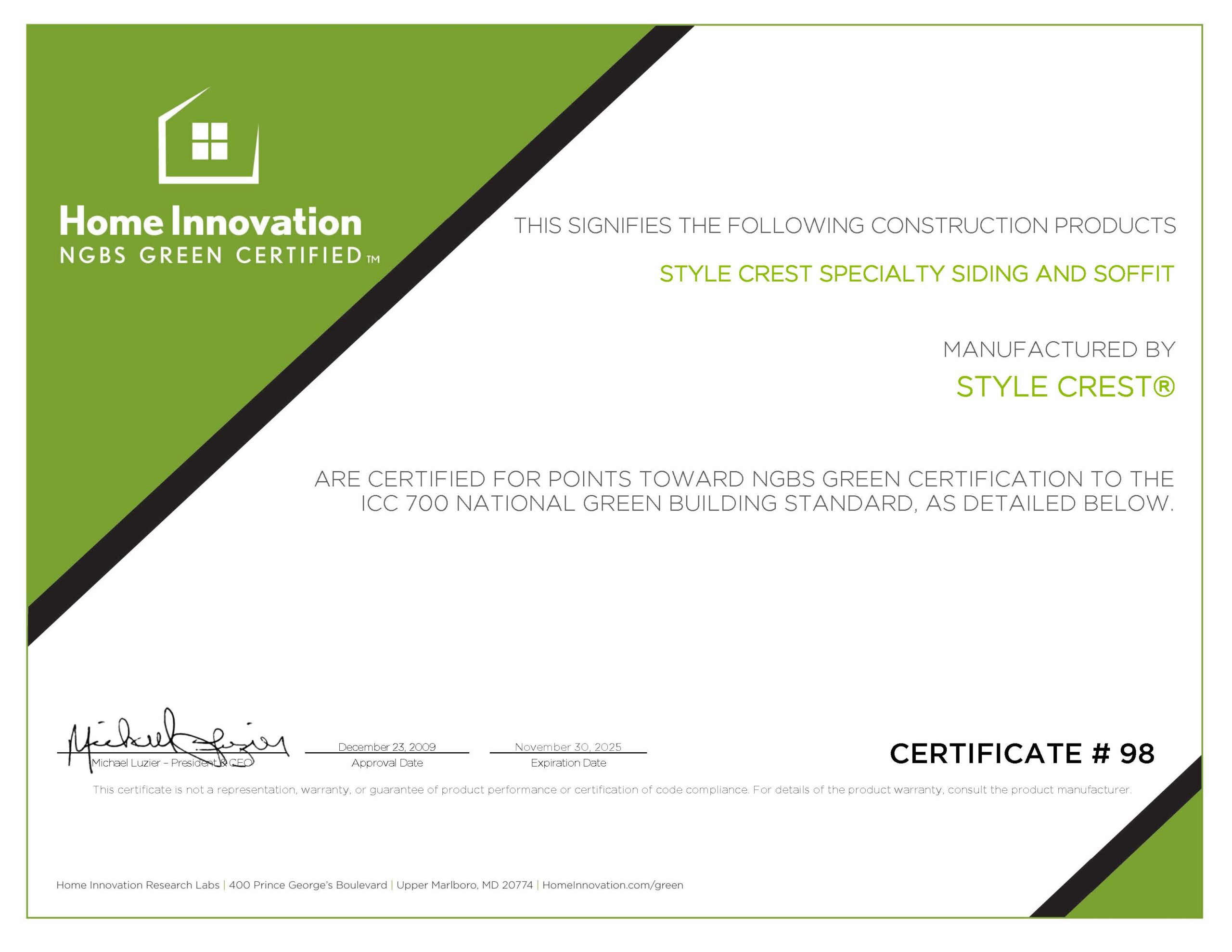 All Style Crest Siding is NGBS Green Certified and contains high-quality recycled content that reduces the product's impact on landfills and the environment.
